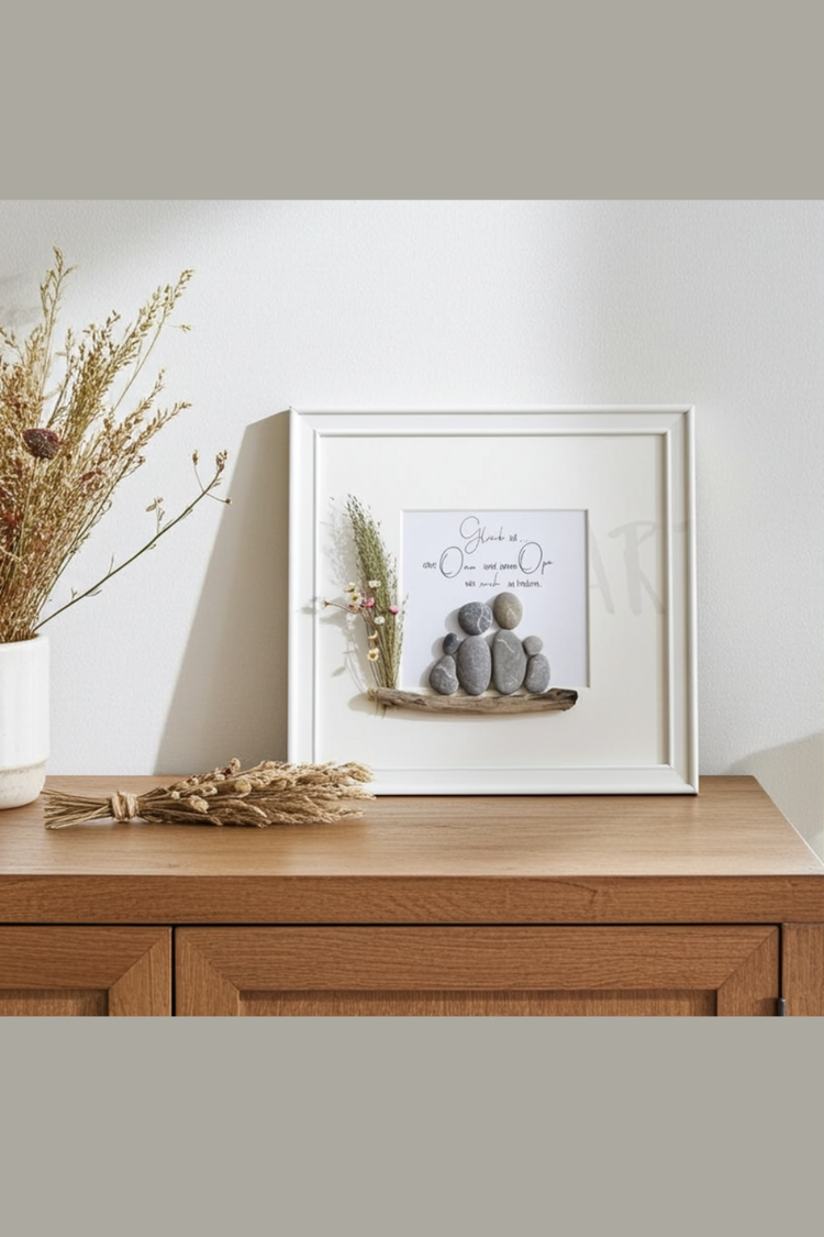 Jedes Steinbild für Großeltern entsteht aus echten Naturkieseln und Naturmaterialien. Viele Motive zeigen Oma, Opa und Enkel oder stellen die Familie als Einheit dar. Dadurch sind diese Steinbilder für Oma und Opa besonders beliebte Geschenke zum Geburtstag, zu Weihnachten oder als liebevolle Aufmerksamkeit zwischendurch.