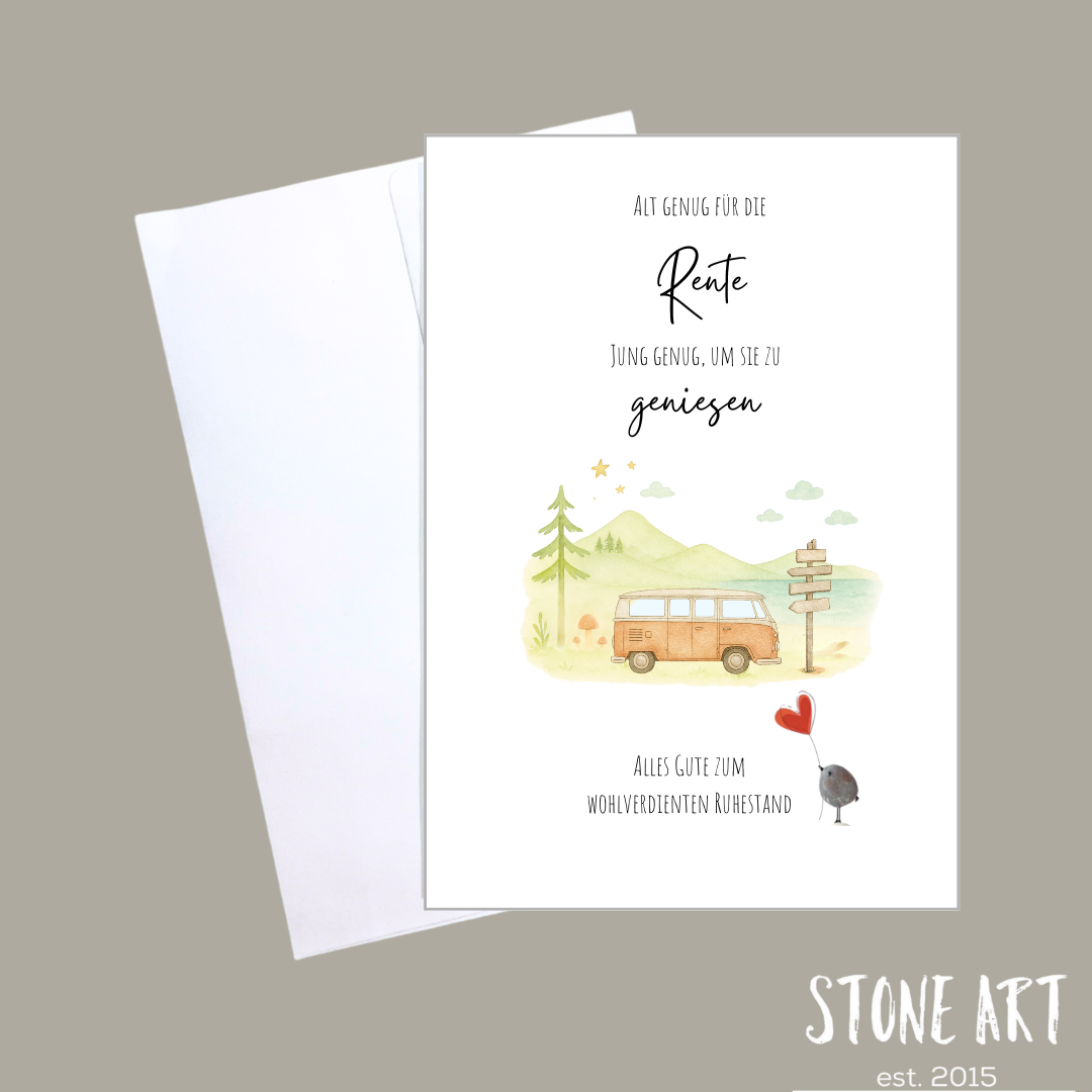 Du suchst ein Abschiedsgeschenk für eine geschätzte Kollegin oder Kollegin zum Ruhestand, das mehr ist als nur eine Karte? Diese handgefertigte Karte kombiniert ein Mini-Steinbild mit Trockenblumen und dem liebevollen Spruch „Alt genug für die Rente, jung genug um sie zu genießen“.