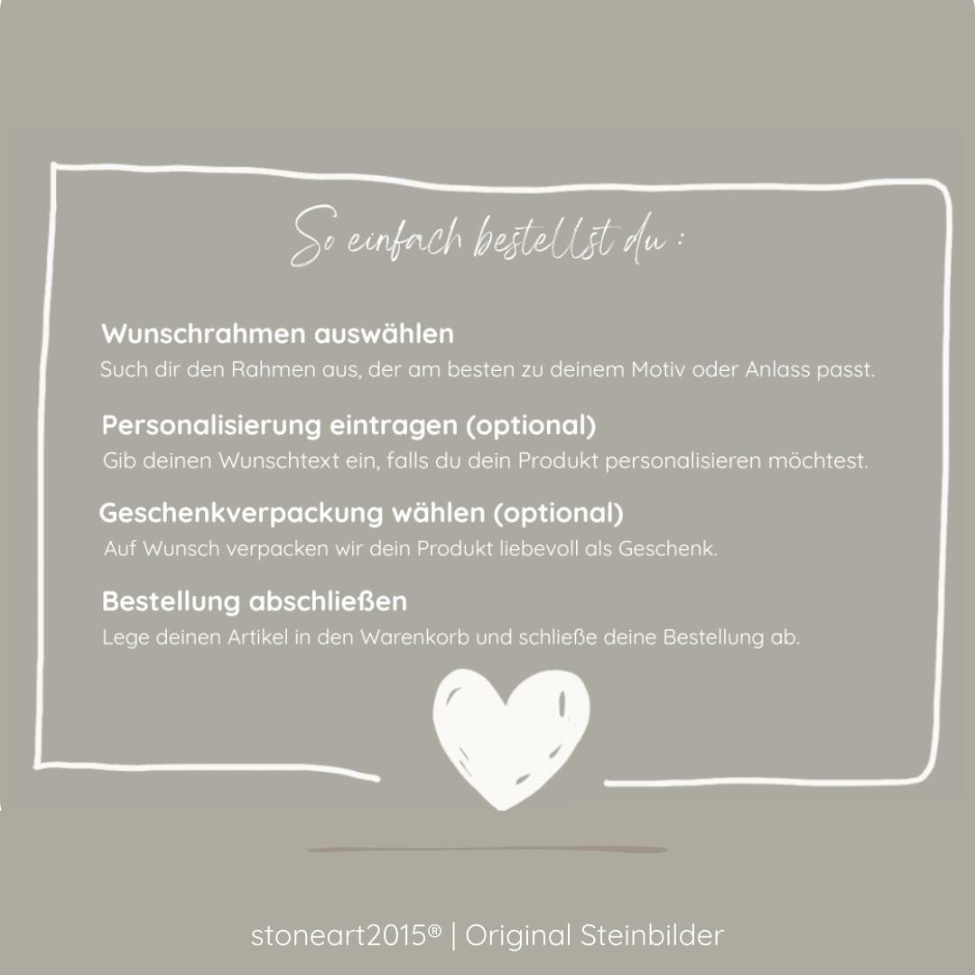 Ogni nostro quadro in pietra è un pezzo unico, realizzato a mano, progettato con cura e attenzione per te dopo aver ricevuto l'ordine. Puoi personalizzarlo completamente: inserisci semplicemente il testo desiderato nel campo di personalizzazione. Sarò felice di dare vita alle tue idee.