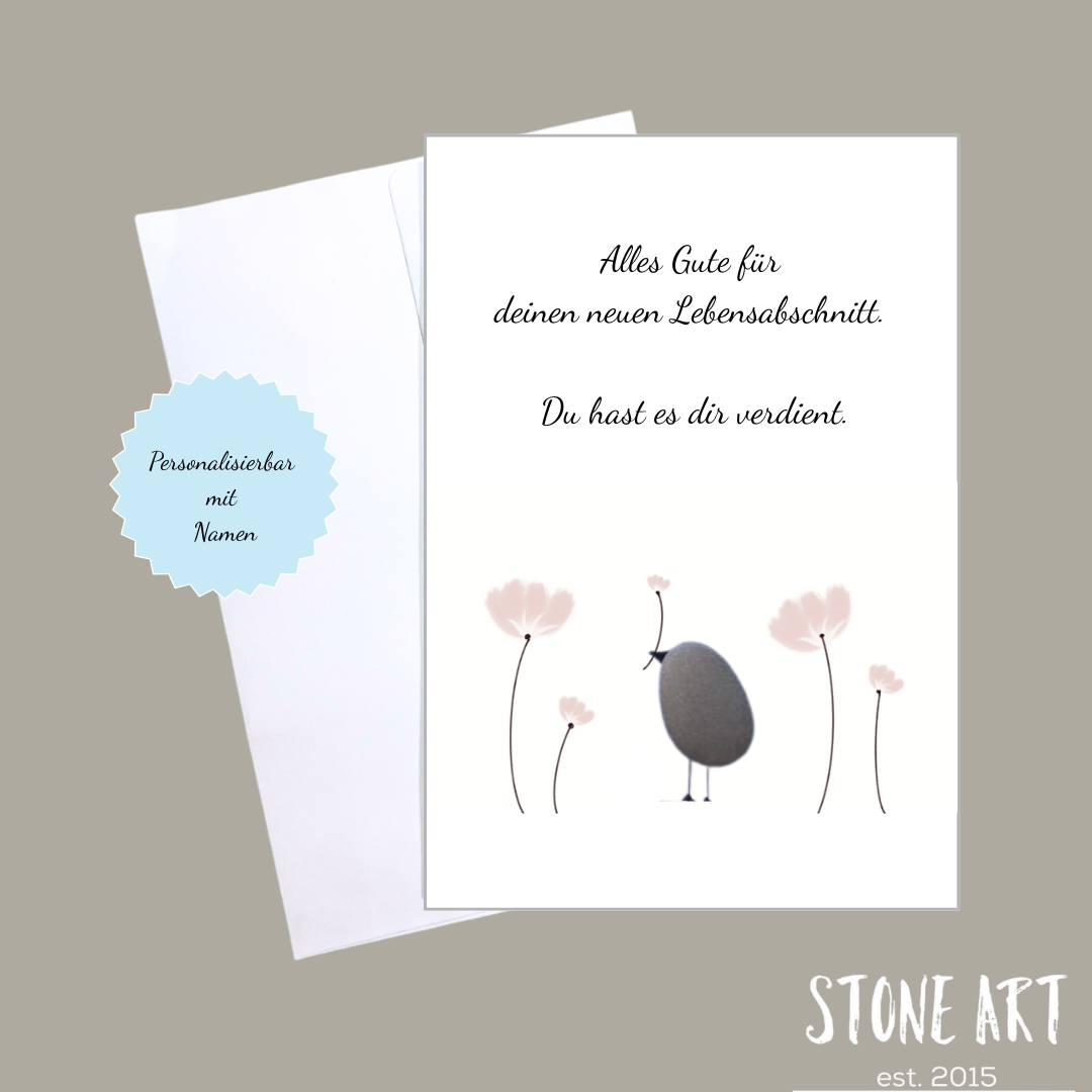 Du bekommst eine besondere Karte, die Abschied, Dank und neue Wege zugleich ausdrückt – mit einem kleinen Steinbildelement und Trockenblumen, hochwertig verarbeitet.