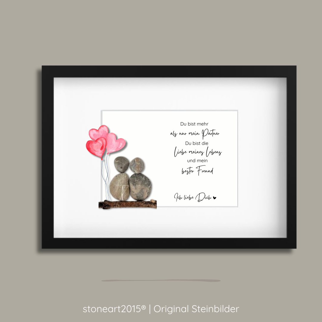 Das Steinbild zeigt zwei Figuren aus Natursteinen, die miteinander verbunden sind. Jeder Stein wird sorgfältig ausgewählt und von Hand arrangiert. Dadurch entsteht ein einzigartiges Kunstwerk, das Nähe, Vertrauen und Zusammenhalt symbolisiert. Kein Steinbild gleicht dem anderen – genauso wie jede Liebesgeschichte ihre eigene ist.