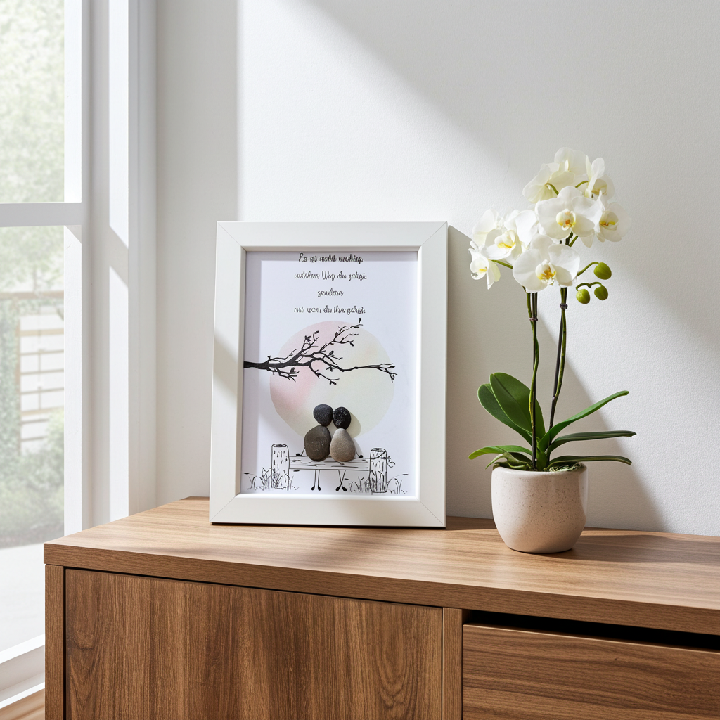 Jedes Steinbild wird liebevoll aus echten Naturmaterialien gefertigt. Dadurch entsteht ein romantisches Wandbild, das zeitlos wirkt und sich harmonisch in jedes Zuhause einfügt – ob modern, klassisch oder gemütlich. Durch den Bilderrahmen wird das Motiv zusätzlich aufgewertet und eignet sich ideal als hochwertiges Hochzeitsgeschenk oder Hochzeitstag Geschenk.