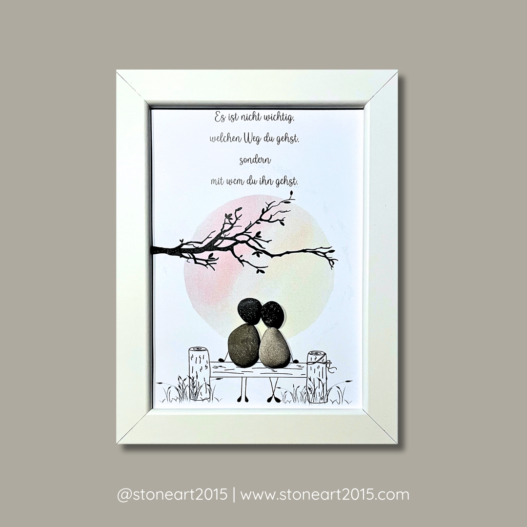 Dieses handgefertigte Steinbild mit dem Spruch „Es ist nicht wichtig, welchen Weg du gehst“ steht für Zusammenhalt, Liebe und das gemeinsame Vorwärtsgehen als Paar.